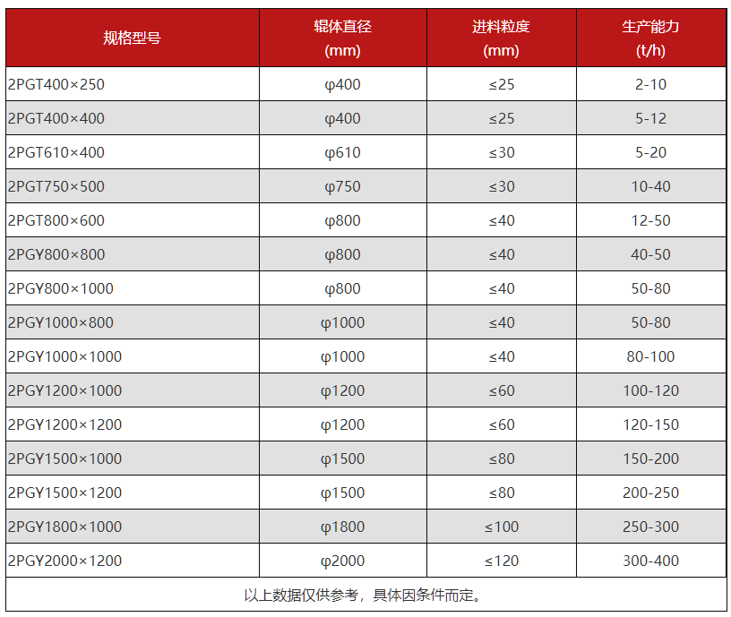 3、2PGY750×500,2PGY800×600,2PGY800x800,2PGY1000×800時產20-80噸,屬于中型液壓對輥破碎機,液壓機型更智能,產量更高,更省成本。